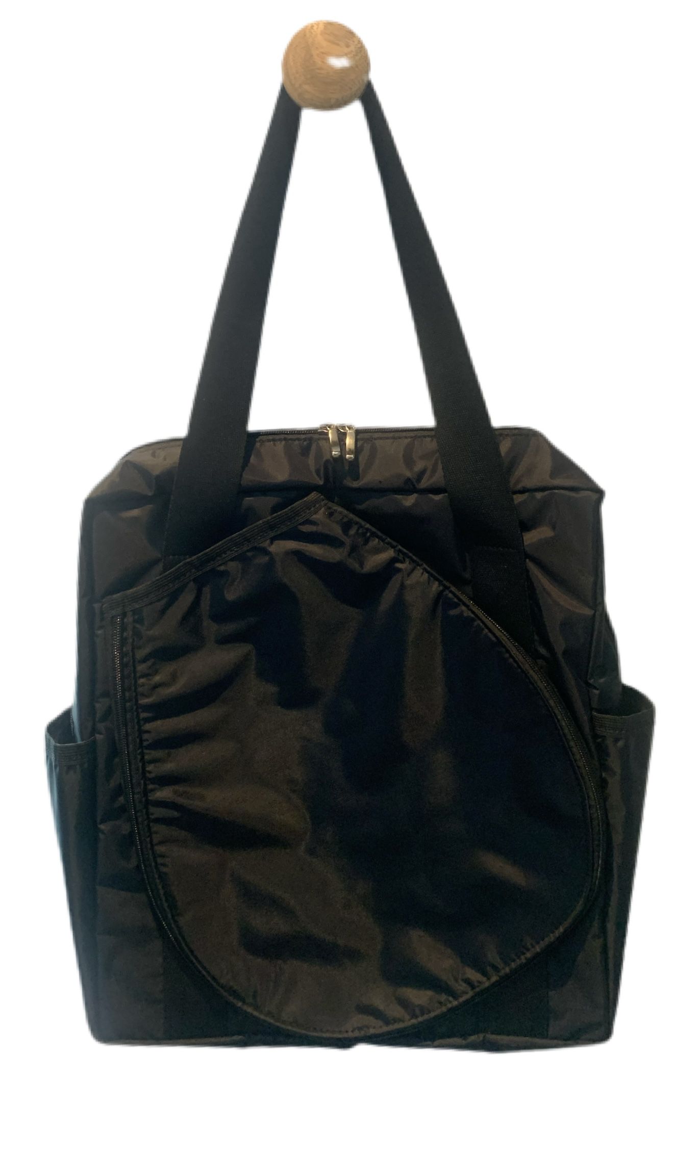 Tem uma divisória na frente para a raquete E uma parte atrás bem espaçosa